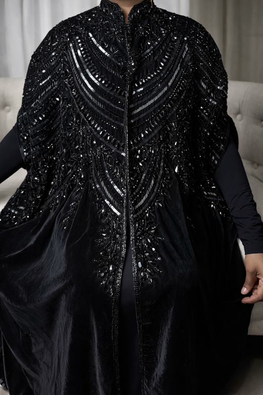 A regal deep- navy velvet abaya adorned with intricate crystal embrodiery for an effortlessly royal...