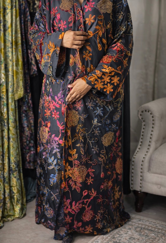 Luxury velvet abaya adorned with multi-color embroidered florals and shimmering thread-work, designed to flow beautifully...