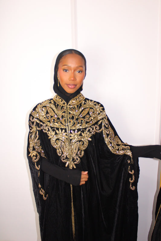 A regal velvet abaya adorned with intricate hand-embellished gold embroidery, designed to embody elegance, luxury,...