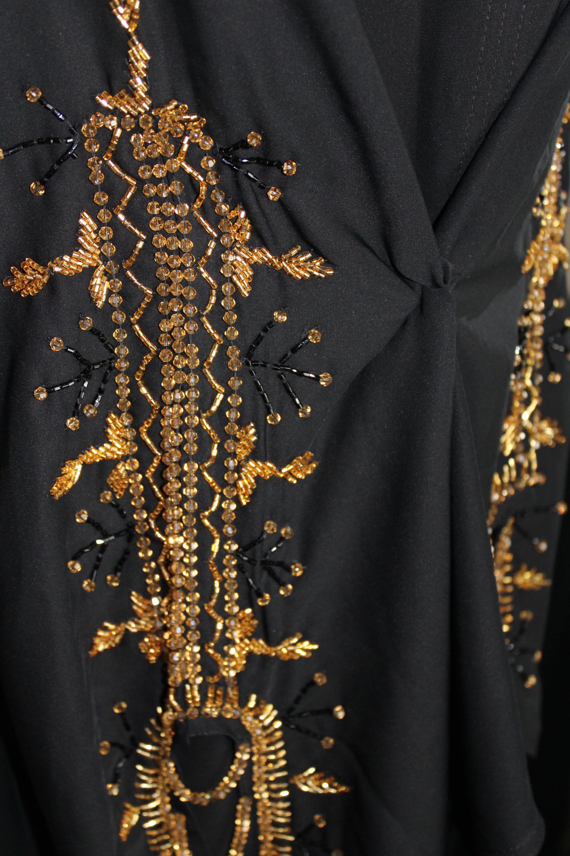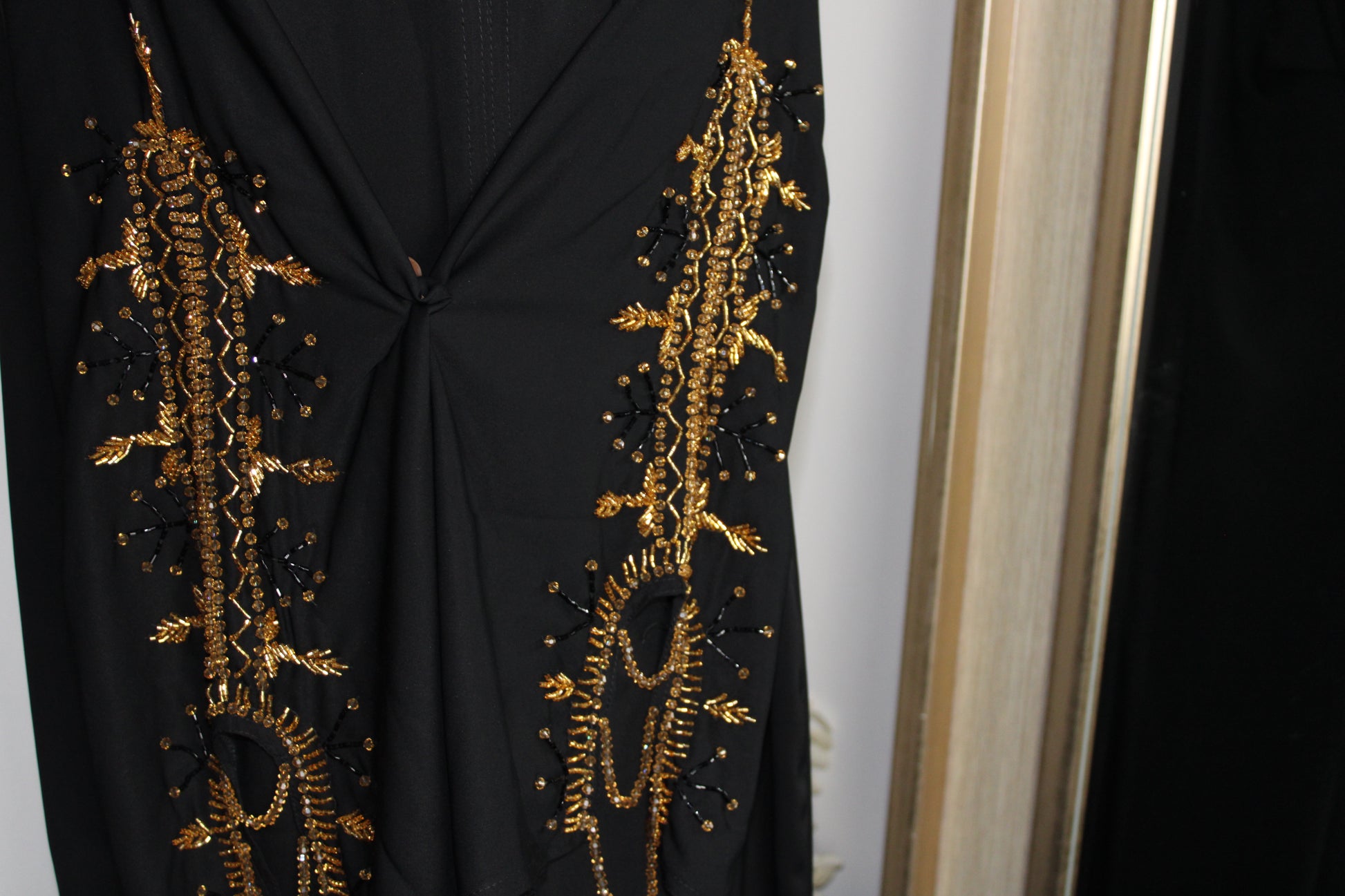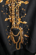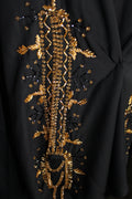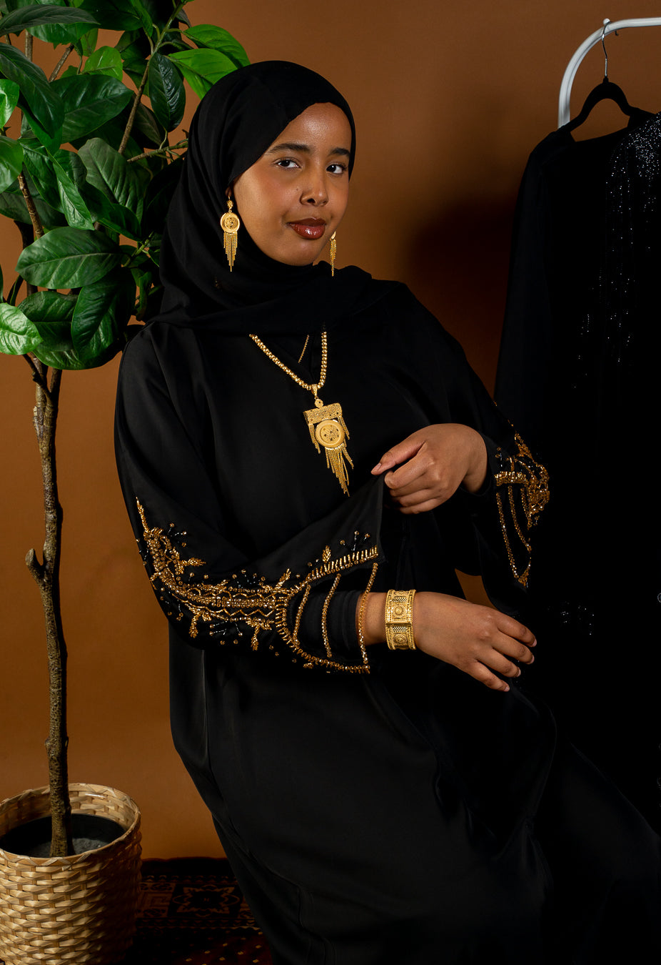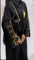Embrace Elegance with our luxurious black abaya featuring intricate hand-sewn gold detailing along the sleeves and cuffs. This masterpiece is designed for those who appreciate sophistication and craftsmanship. This abaya adds a touch of regal beauty to your wardrobe.