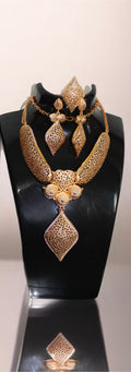 A striking ensemble inspired by traditional Somali artistry. The Dahabo set features bold diamond shaped designs, symbolizing strength and elegance. Crafted with intricate gold detailing, this set captures timeless beauty - perfect for grand occasions.
