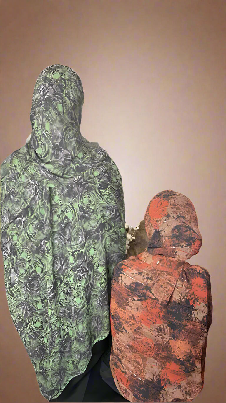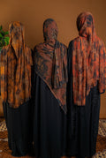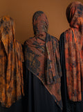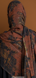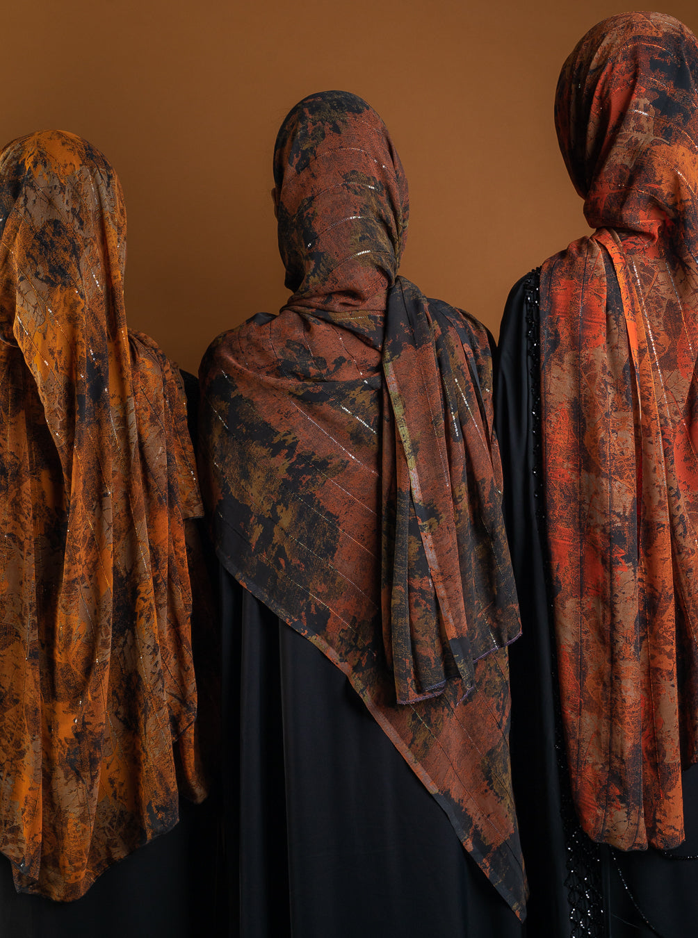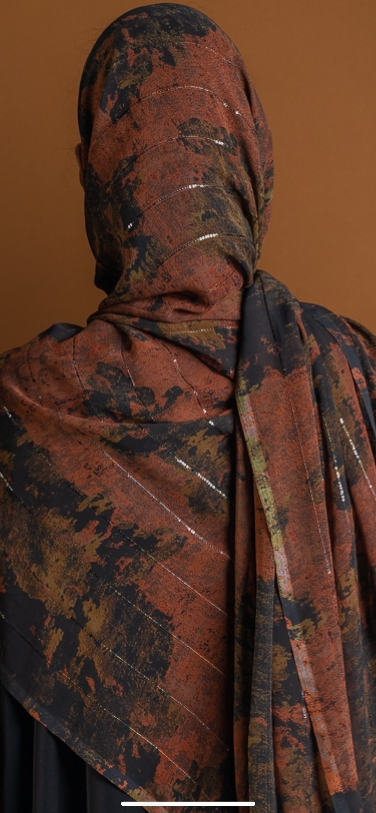 Elevate your look with Hodan, a silk chiffon hijab inspired by the richness of earth tones. Featuring a deep hues of burn orange, olive, green, purples, plum and red with subtle gold shimmer, this hijab offers effortless elegance for any occasion .
