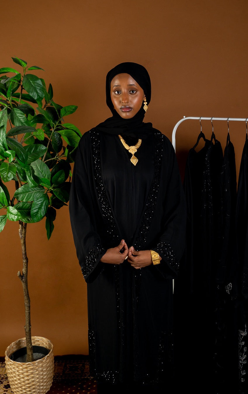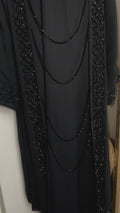 This abaya is designed for the woman who embodies elegance and grace. Crafted from the finest black chiffon, this masterpiece features intricate hand-sewn beaded latticework along the sleeves and sides, shimmering under the light like stars in the night sky. Delicate Chain embellishments drape across the back, adding a regal touch to its flowing silhouette.