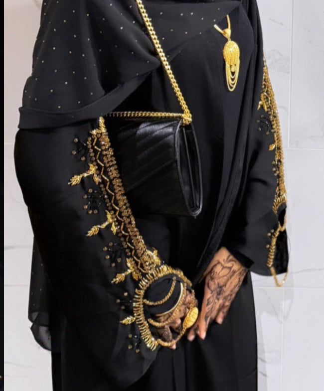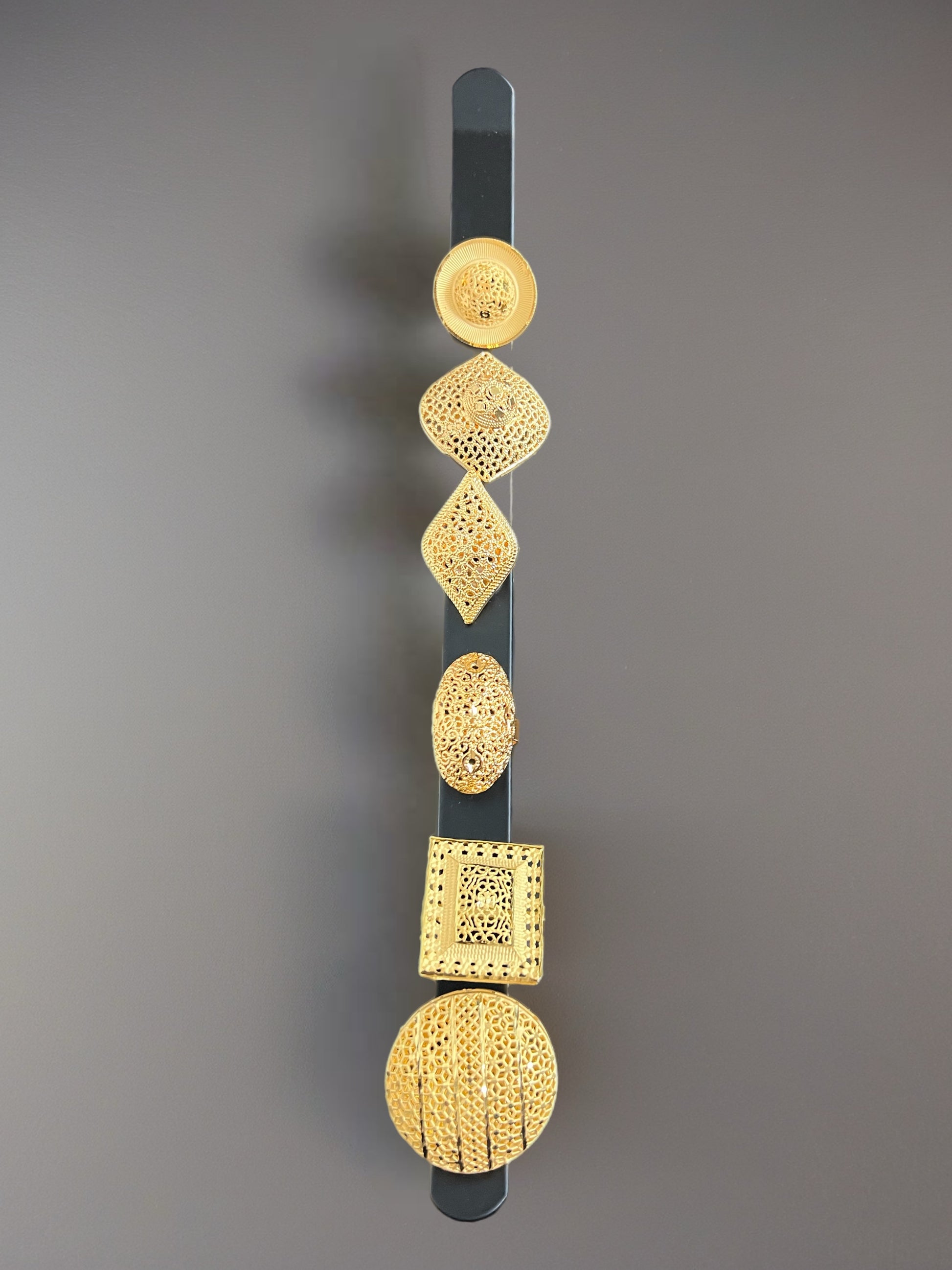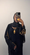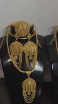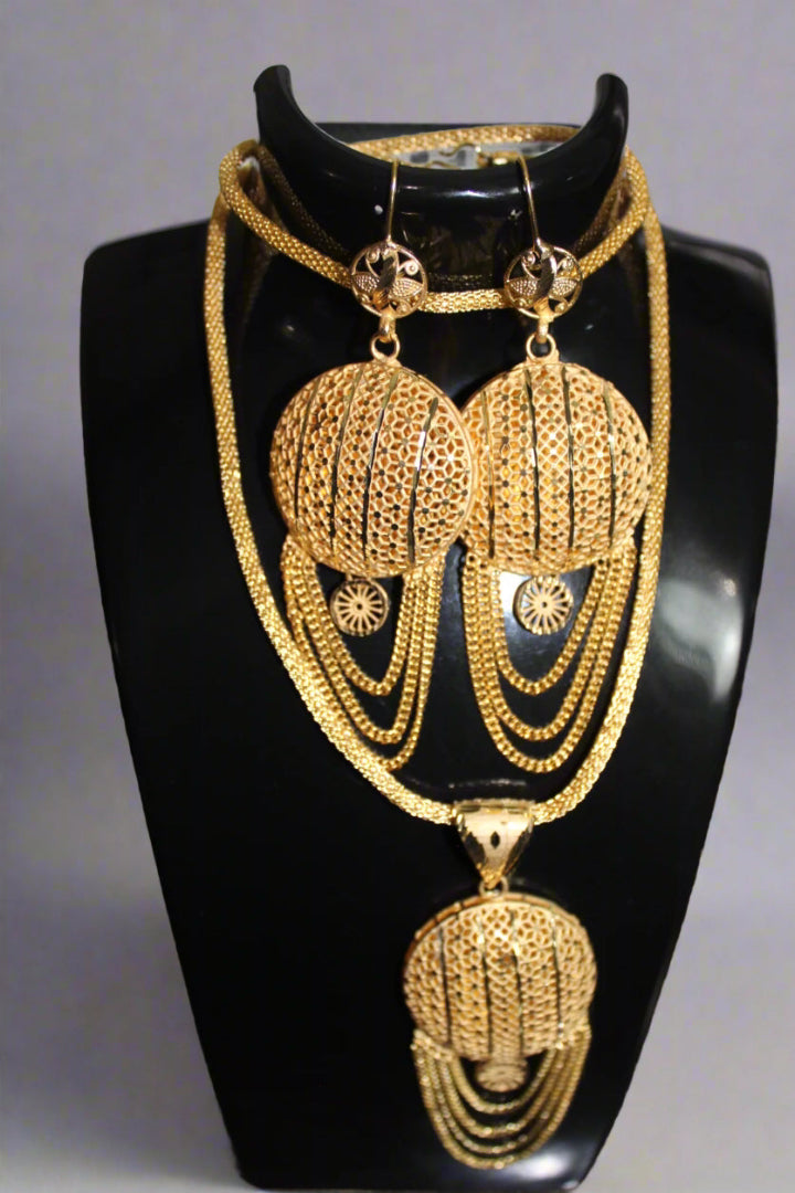 Elevate your elegance with the Dahab Quruxley jewelry set - a radian expression of heritage, femininity , and grace. This luxurious four -piece set includes a statement necklace, matching drop earrings, a coordinating bracelet , and a beautifully detailed ring - Each piece crafted with care to embody the richness of East African and Middle Eastern gold traditions.