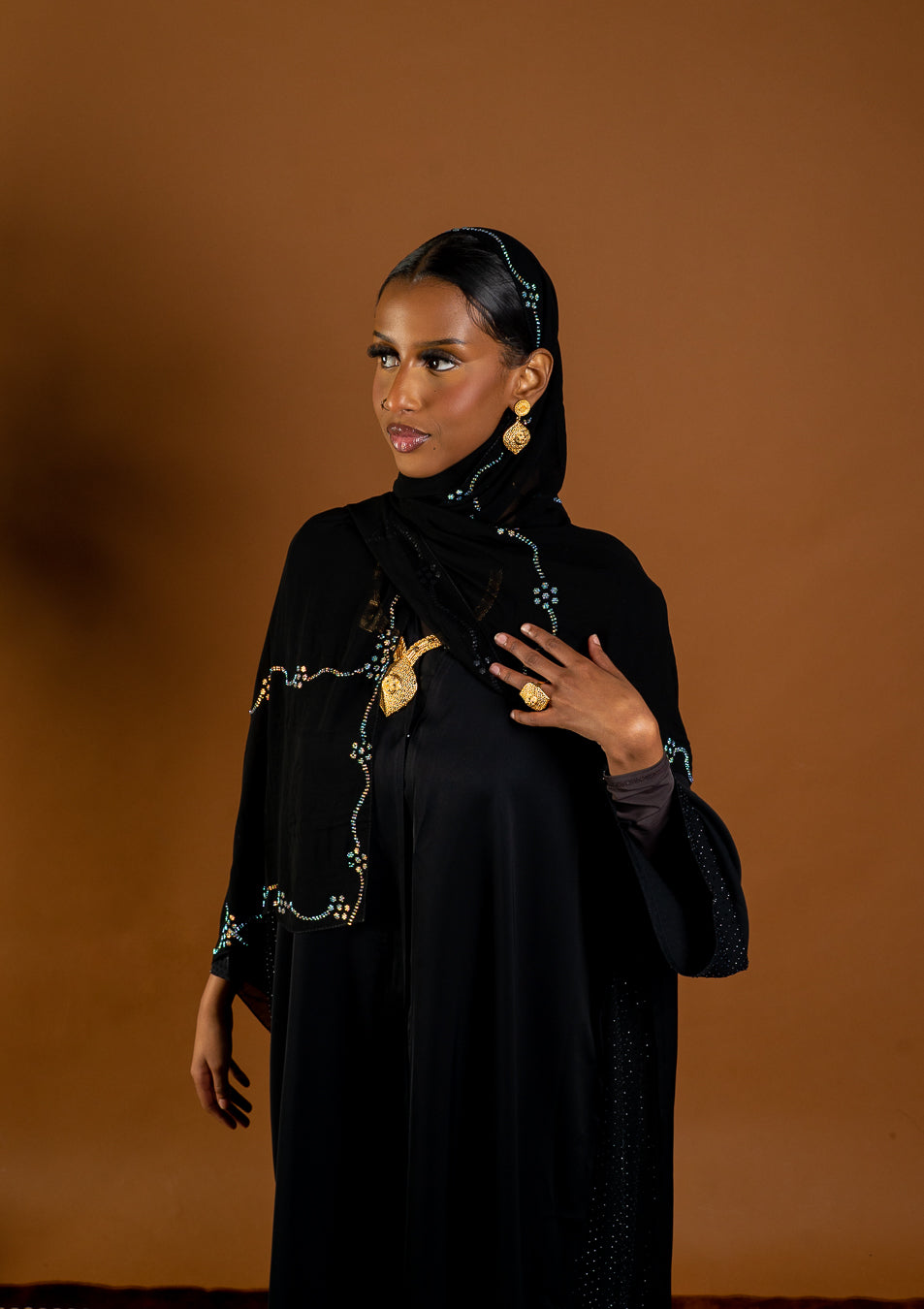 A graceful take on elegance, Ubax is a black chiffon hijab adorned with soft, shimmering floral hand-sewn embroidery that catches the light with every movement, designed for women who love subtle beauty with a hint of glam, its perfect for evening or special occasions.