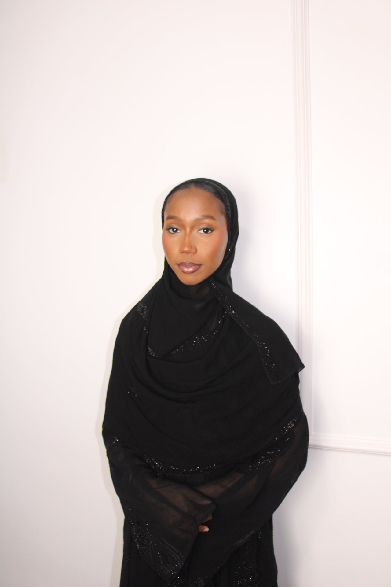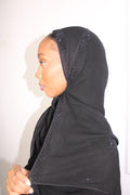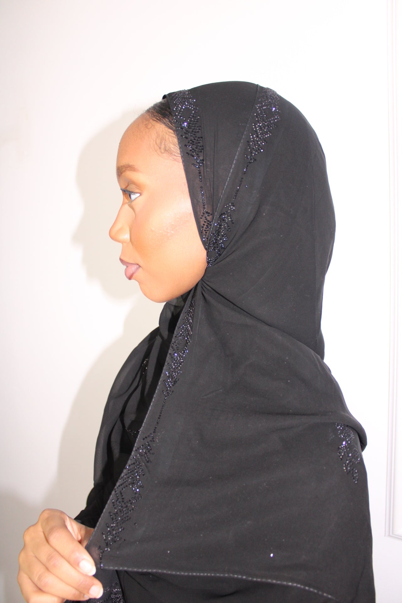 A luxurious deep black hijab adorned with elegant black stone embellishments arranged in delicate patterns. Subtle yet striking, it catches the light beaitfully while maintaining a refined, sophisticated look. Perfect for formal occasions and elevated everyday wear.