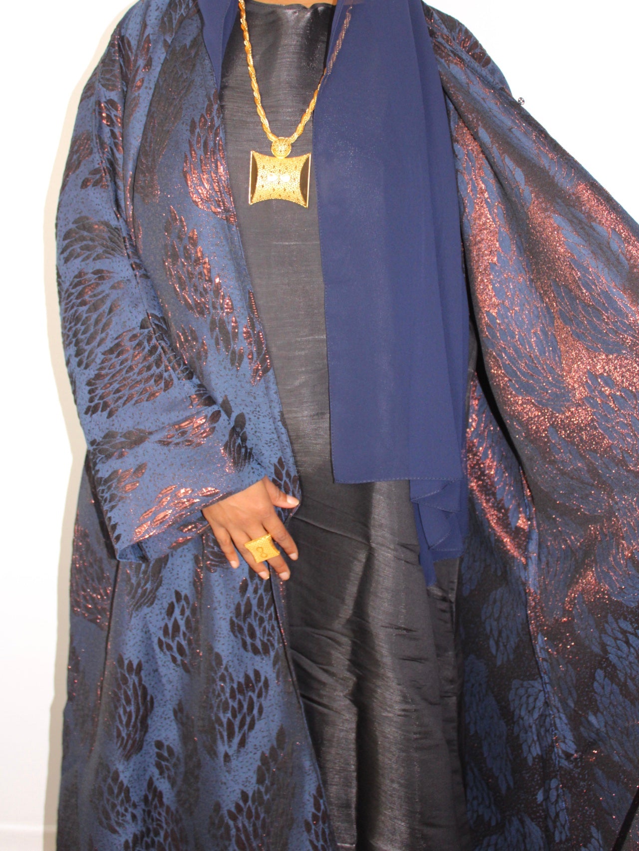 A deep midnight navy kimono woven with subtle metallic floral textures. Flowing, elegant, and effortlessly graceful for refined occasions.