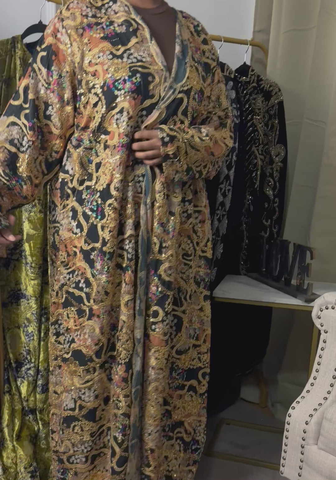 A richly Detailed kimono featuring heavy gold embroidery and intricate lacework over a structured mesh base for a bold luxury statement.