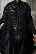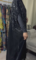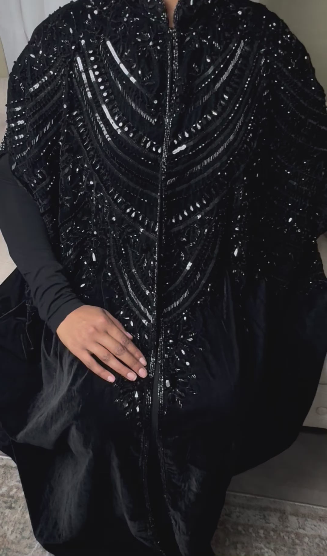 The reyna velvet anaya embodies quiet royalty and refined elegance. Crafted from rich velvet and adorned ith intricate black beadwork and sequin embellishments, this statement piece flows gracefully while capturing the essence of modest luxury. Perfect for formal gatherings and special evenings