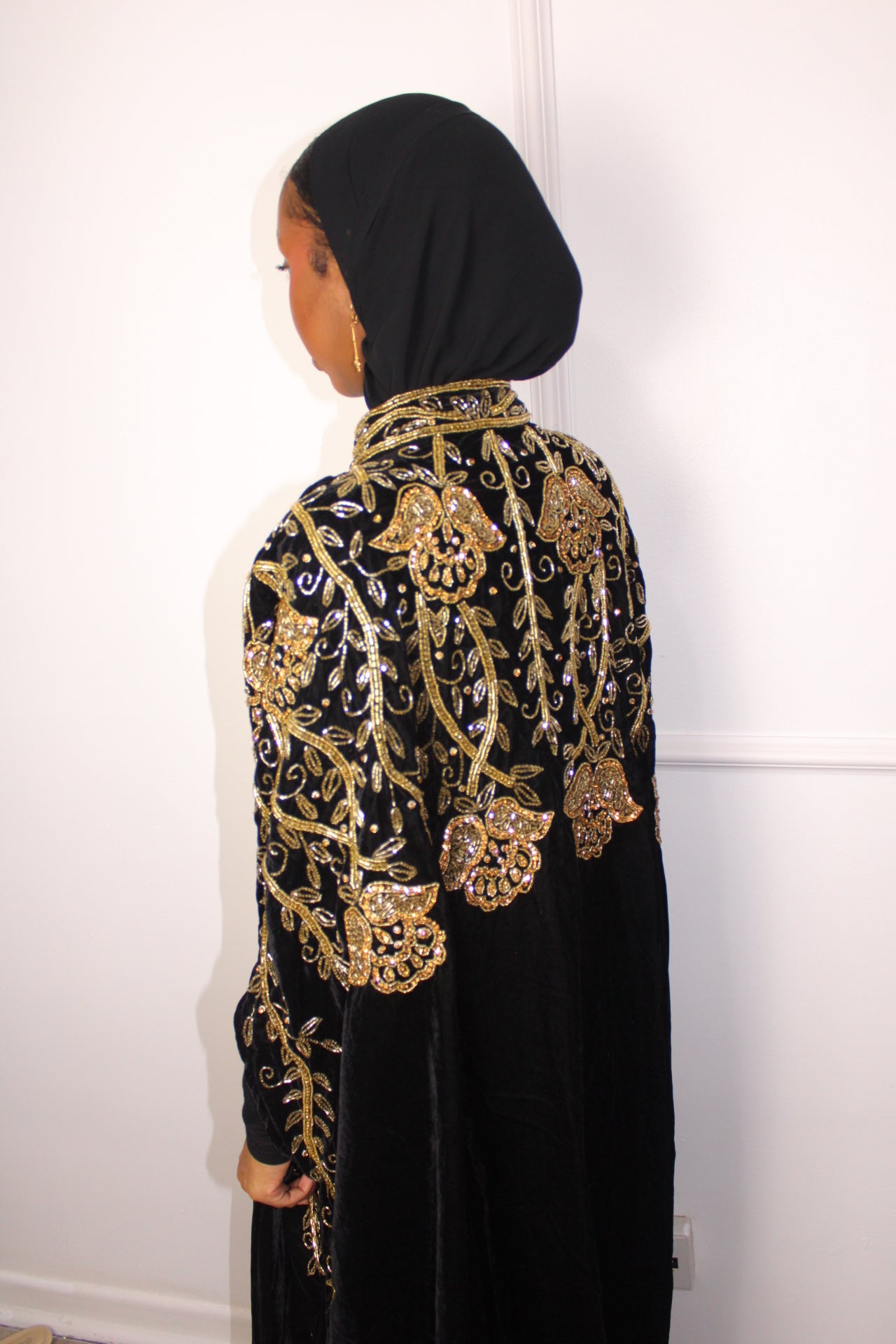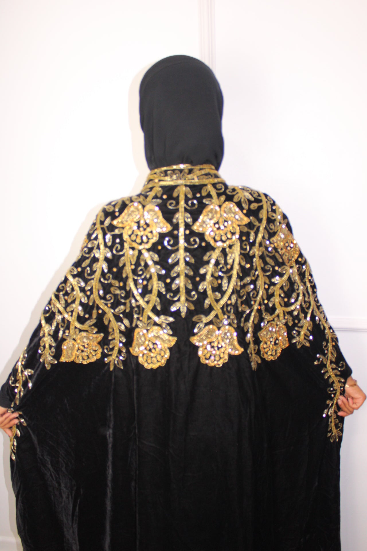 A regal black velvet abaya adorned with rich gold embroidery for a bold, elegant statement.