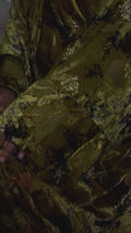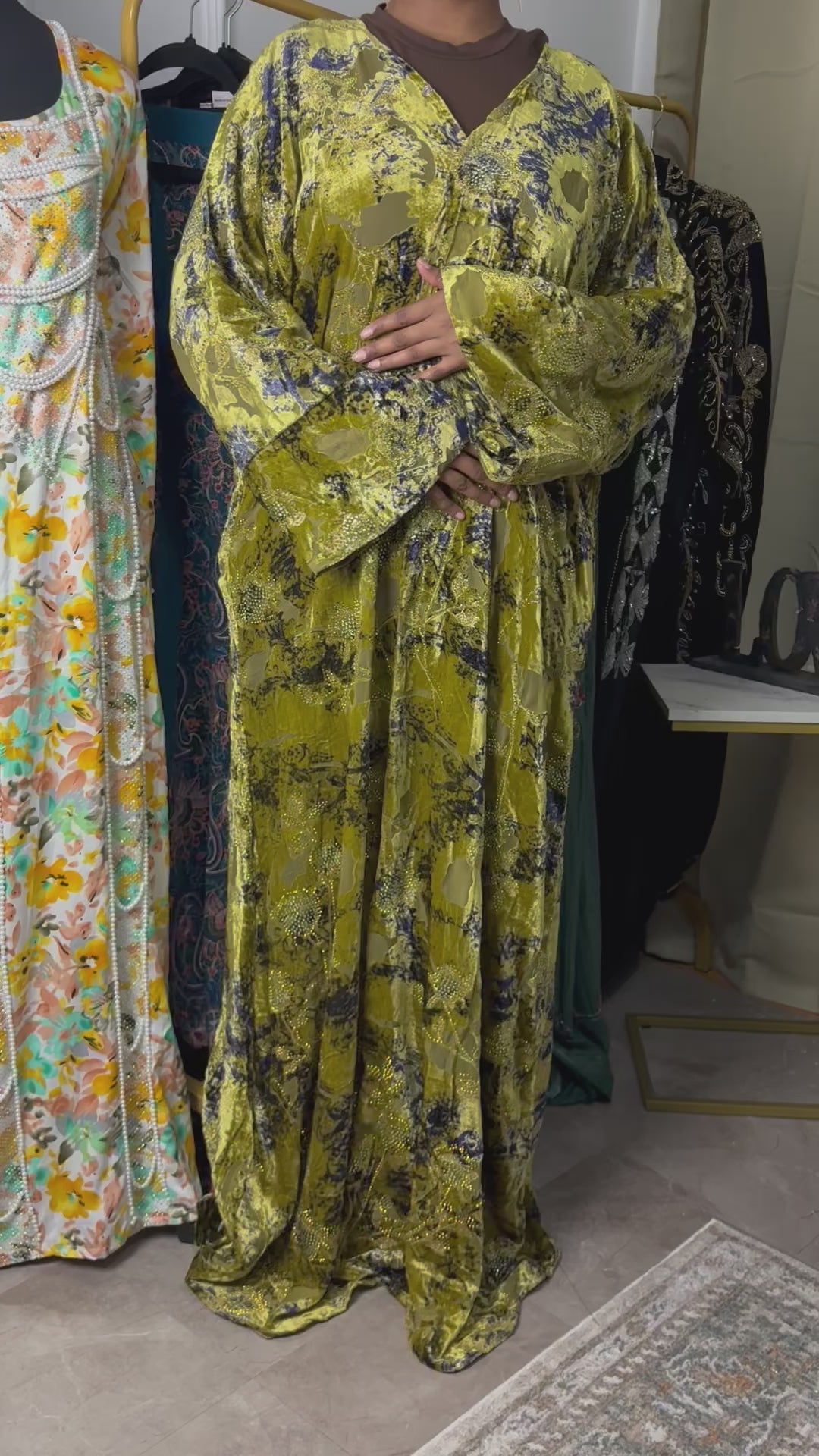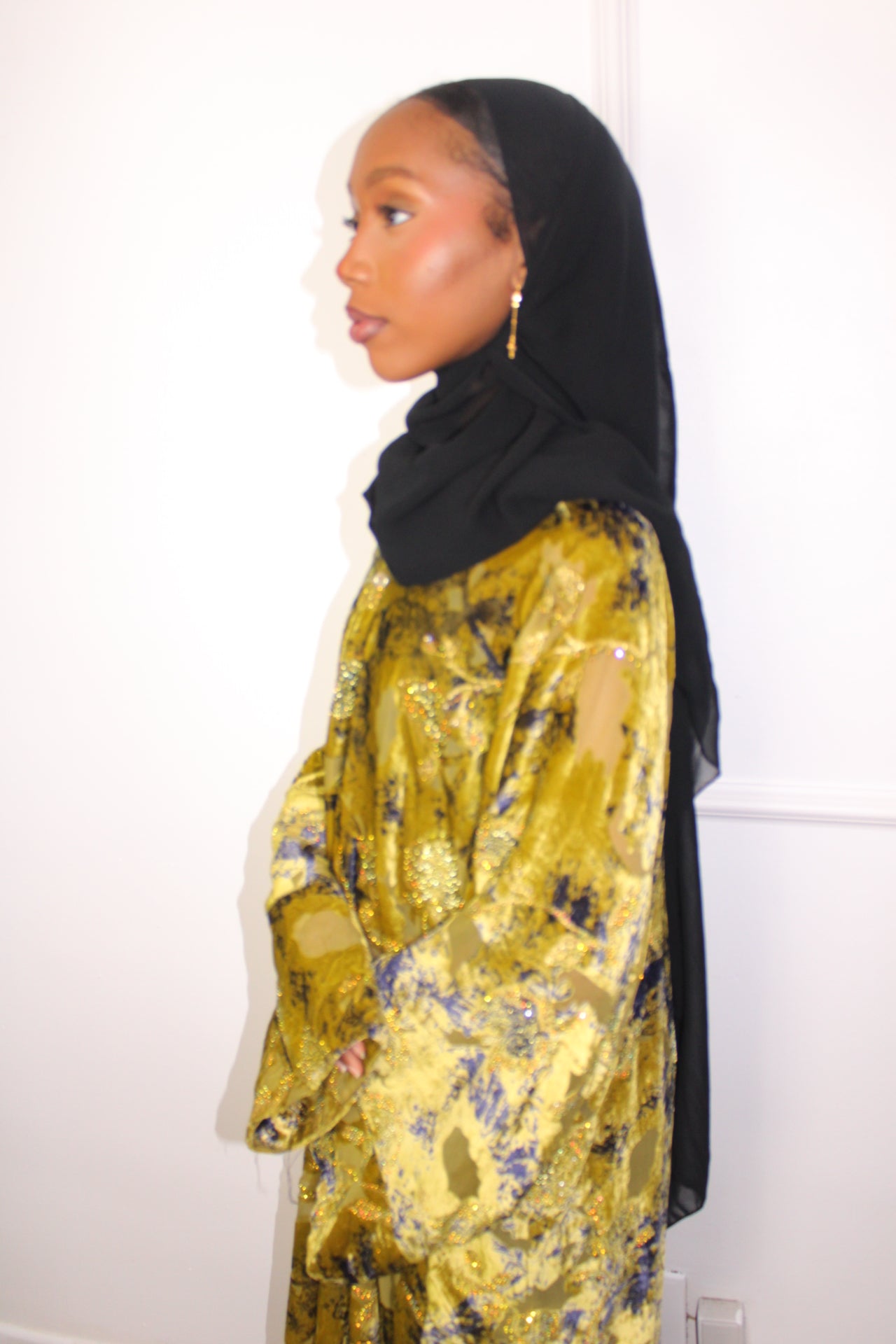 A regal velvet abaya featuring rich gold tones and flowing drape, designed for elegant statement wear.